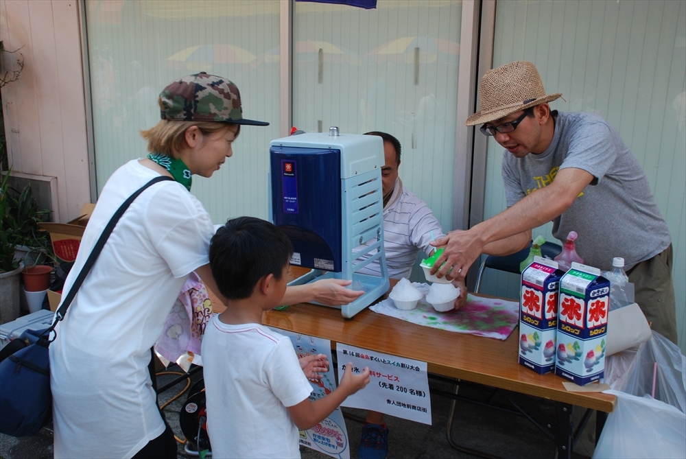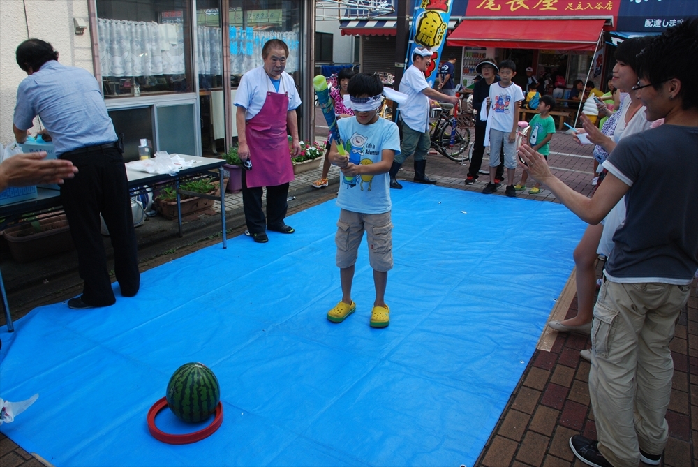7月24日(日)、舎人団地前商店街(田中功一理事長)で「第16回金魚すくいとスイカ割り」が行われました。無料で参加できるイベントとあって大人も子どもも大勢が参加しました。
